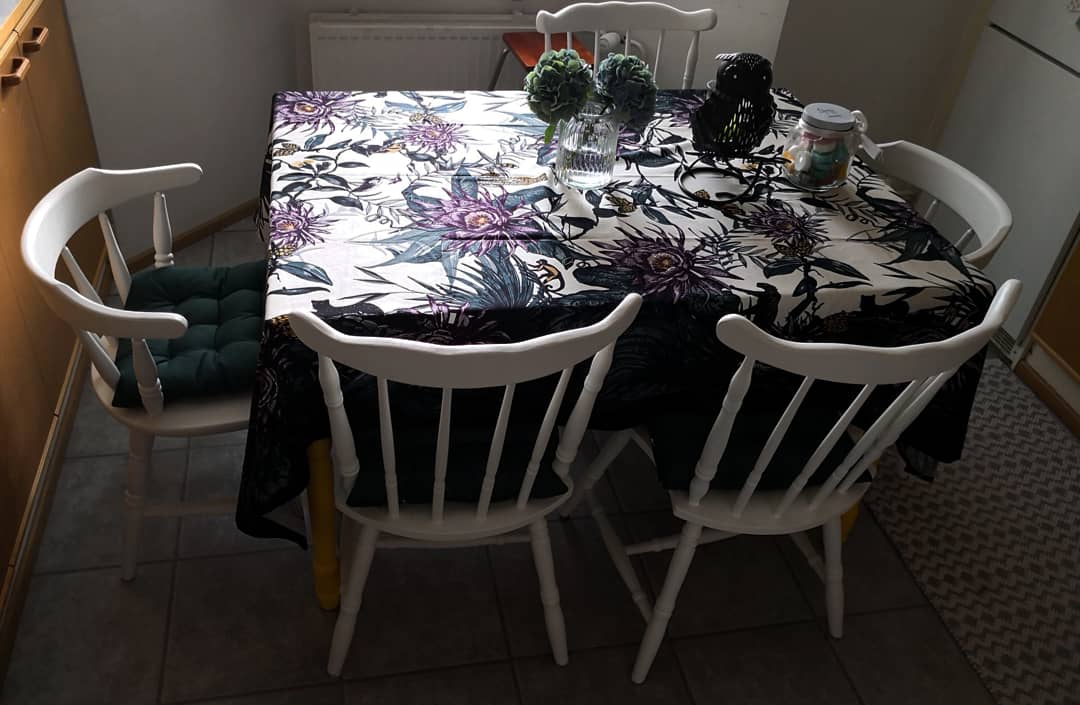 Syksy on tunnelmaa! Ja se saa näkyä kotona. Jostain syystä myös tulee hankittua hieman "tummempaa" tekstiiliä kotiin. Niinkuin nyt kävi keittiön sisustuksessa. Tummanpuhuva ja iso printtinen pöytäliina ja tummanvihreät, melkeinpä myrkynvihreät tuolien pehmusteet hankin H&M Home verkkokaupasta.